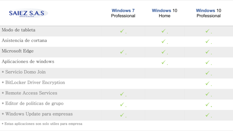 Diferencias entre Windows 7 Pro, 10 Pro y Home
